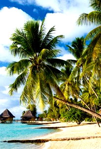 This image captures the tranquility of a palm tree lined beach with huts, under a clear blue sky. The vibrant greenery and crystal clear water invite one to relax and enjoy the natural beauty.
