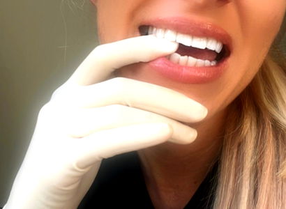 A candid, behind-the-scenes image of the OnlyFans model Nurse Molly, set against the backdrop of a medical exam room. She's captured in a moment of surprise or shock, hand on her mouth, emphasizing her character as a nurse in a lighthearted and non-medical context. The image captures the contrast between her professional persona and the candid nature of this shot.