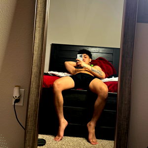A shirtless man in a bathroom mirror, showing off his physique. The image is of a person in their mid-twenties, possibly in the context of Onlyfans.