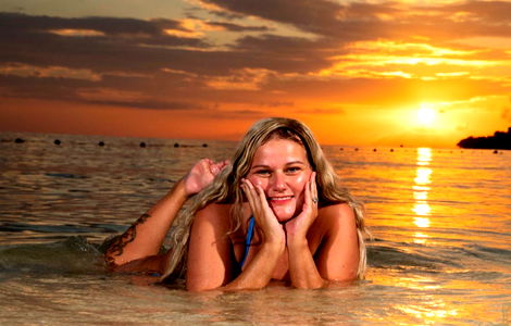 NymphoJeanie, an Indiana-based model, strikes a pose on the beach at sunset. She radiates joy and confidence in her transparent lingerie. With the warm hues of the sunset in the background, the image captures a candid moment of NymphoJeanie enjoying her time by the ocean.