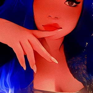 A digitally enhanced image of a character resembling an OnlyFans model, with vibrant blue hair and confident pose.
