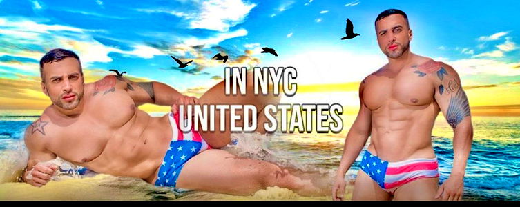The image showcases a Brazilian male model with well-defined muscles, wearing a sports bra and briefs. He is posing confidently, flexing his chest muscles, and displaying a tattoo on his arm. The model's fit physique suggests a dedication to fitness and bodybuilding.