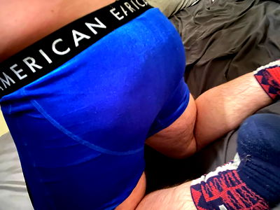 A person is laying under a comforter with socks on their feet. The socks feature the NHL logo and text. The individual appears to be male based on the visible clothing items. OnlyFans username 'GayFarm' suggests the context of the image.