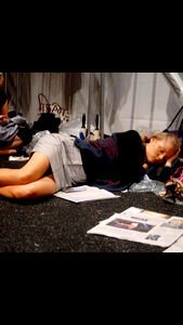 An OnlyFans model, identifiable by the username 'u7198444', is depicted in a relaxed sleep-like pose on a busy street. The individual appears to be a female adult.