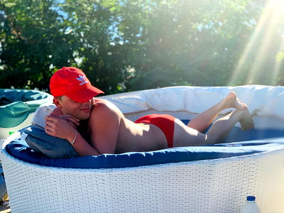 A candid moment captures the 28-year-old model Ollie from England enjoying a sunny day in a hot tub. Wearing a red baseball cap and a vibrant orange bikini, he strikes a relaxed pose against the backdrop of a sunny afternoon. The image encapsulates the essence of summer leisure with its warm tones and carefree atmosphere.