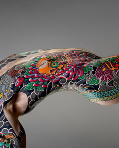 The image captures a person in a casual setting. The focus of the image is on an individual who is partially clothed, with their shoulder, stomach, and joint areas prominently visible. This individual seems to be a lover of body art, as they sport a detailed tattoo, which appears to be meticulously inked over a significant portion of their visible skin. The tattoo's complexity and the extent to which it covers the body suggests that it might carry a personal or symbolic significance for the person. The clothing worn by the individual is minimal, which further accentuates the visibility of the tattoo. The garment seems to be of a casual style, perhaps reflecting the person's laid-back personality or their comfort in their own skin. The overall composition of the image leaves an impression of a person who is confident and expressive, using their body as a canvas to showcase their individuality and personal style. The stark contrast between the skin and the tattoo adds to the visual intrigue of the image.