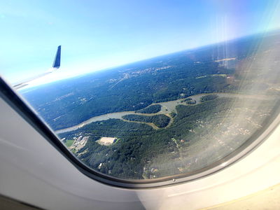 A photograph capturing the breathtaking view of a cityscape beneath the airplane, taken through the window. The image showcases the vastness and beauty of the urban landscape when viewed from above.
