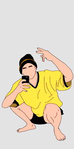 A youthful, energetic cartoon character in a hip-hop pose. Wearing a yellow shirt and black cap, holding a cell phone, with a playful gesture. Onlyfans model name: Oppiy.