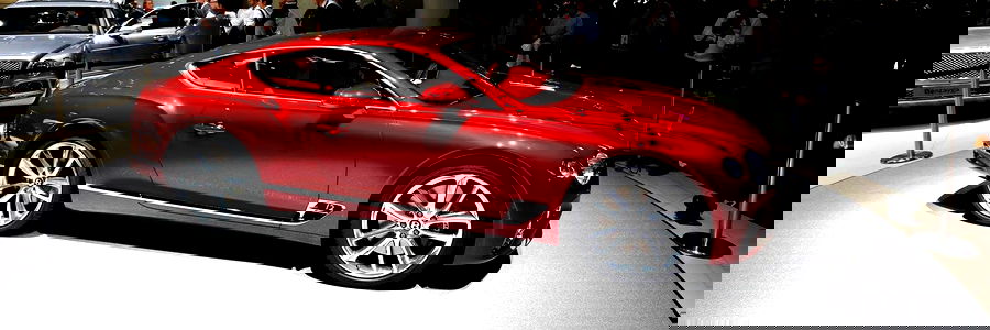 A sleek, red luxury sports car on display at an auto show. This vehicle exudes power and elegance.