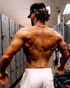 This image depicts a muscular male figure, likely a bodybuilder, in a indoor setting. His physique is prominently showcased, highlighting his well-defined muscles. His chest and abdominal muscles, in particular, are noticeably sculpted, indicating a high level of physical fitness and dedication to bodybuilding. His bare skin is on full display, as he is shirtless, suggesting that he is either preparing for a workout or has just finished one. Likely due to his shirtless state, other parts of his upper body are also in focus, including his shoulders, back, and elbows. The man seems to be standing against a wall, possibly in a gym or a similar space dedicated to physical training. Despite being shirtless, he appears to be wearing some form of clothing, likely shorts or workout pants, although the exact type is not clearly visible. His overall appearance exudes strength and discipline, common traits associated with bodybuilding.