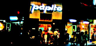 A lively street scene outside a Papito restaurant at night. People are socializing and enjoying their time in the vibrant city atmosphere. The name 'Papito' is visible on a sign, indicating the presence of the restaurant.