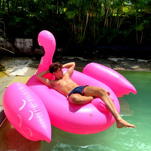 An OnlyFans model is enjoying some downtime on an inflatable pink flamingo float. The individual is lounging on the float, possibly after a workout or a day at the beach. They are shirtless, adding to the relaxed vibe of the scene.