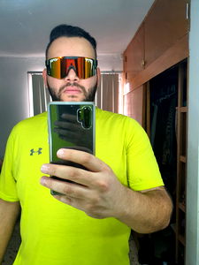 Pedro Garza, fitness enthusiast and content creator, captures his reflection with a phone camera. He is seen in yellow sunglasses, wearing a sleeveless shirt, standing against a plain wall. The image conveys a sense of self-awareness and wellness.