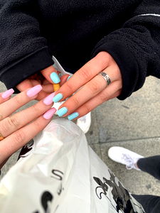 A person with a ring on their finger applies teal nail polish to another's nails, possibly for an event or simply a quick touch-up. They are wearing a black and white striped sweater, indicating casual attire.