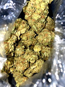 A plastic bag filled with fresh, high-quality marijuana. This is a PhillyBullB model photo.