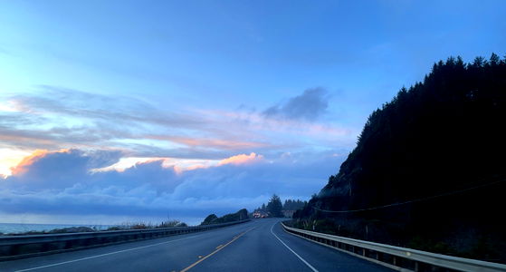 The image captures the tranquil beauty of a coastal highway at sunset. The sky is painted with hues of orange and pink, reflecting off the calm waters in the distance. This serene scene showcases a moment of solitude amidst nature's grandeur. The highway stretches into the horizon, inviting travelers to embark on their journey.