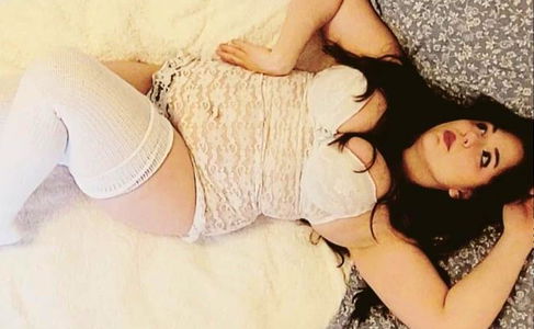 A photo of the OnlyFans model Pomigasm in a bed with her hands on her hips. She is wearing a white top and has long hair.