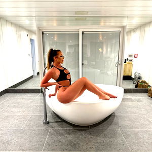 The image showcases a bright and spacious indoor setting, most likely a living area or a lounge. The background is dominated by a plain wall, contributing to the minimalist aesthetic of the room. The floor, partially visible, is of a sleek design, hinting at a modern decorative style. The room is furnished with a single piece of furniture, a chair, placed unobtrusively to one side. The main focus of the image, however, is a young woman, around 28 years of age. She is seated in a relaxed manner, her legs casually extended. She is clad in a swimsuit, her clothing choice suggesting that she might be at a pool party or a beach-themed event. Her attire highlights her toned abdomen and thighs. She is also wearing footwear, possibly sandals or flip-flops. Her face, clearly visible, exudes a sense of confidence and ease. The woman's youthful appearance and stylish outfit add a vibrant energy to the scene. Overall, the image captures a laid-back, leisurely moment in a stylish indoor environment.