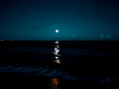 Christina's image captures a dramatic night scene on the ocean, under the glow of a full moon. The calm waters stretch to the horizon, reflecting the ethereal light of the celestial body above. This serene landscape is framed by the dark sky, adding depth and contrast to the scene. The tranquility of the water and the vastness of the night sky create an image that is both soothing and awe-inspiring display of natural beauty.