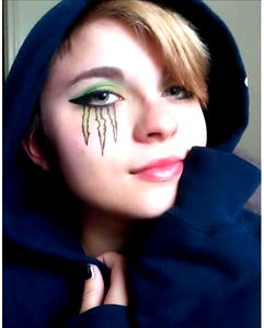 Max, a popular Onlyfans model, sports green and silver eye makeup. She is seen here in her signature style, which includes a hoodie and a casual pose. The image captures the essence of her online persona, blending elements of glamour and streetwear.