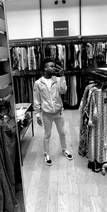 JaCoby is seen taking a mirror selfie inside a clothing store. He's dressed casually, standing amidst the racks of clothes. His reflection mirrors his outfit and the store surroundings.