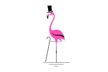 A chic and fashionable flamingo model for Pretty Boy Mag, standing tall in a pink dress on a podium. The epitome of style and confidence.