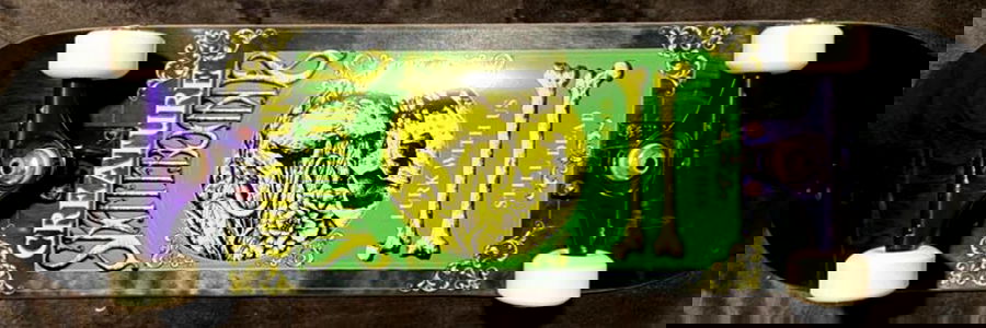 A vintage skateboard featuring a unique design with text and imagery. The deck is adorned with various elements including a skull, a cross, and a monkey's head, evoking a sense of history and individuality. This skateboard could be an excellent piece for collectors or individuals looking to express their style through skateboarding.