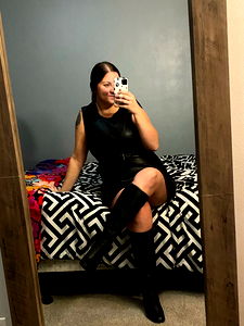 A beautiful woman with long hair is leaning against a mirror, holding her phone. She's wearing black boots and holds a black purse. She has a necklace on and seems to be at home, as indicated by the bed in the background.