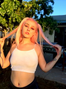 This is a photo of Jadey Baby, a model on OnlyFans. She is standing outdoors with pink hair and a white tank top, sporting a confident pose.