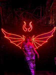 Intense purple lights illuminate a vibrant room, where the popular model Princess is captured in her element. She's positioned near an illuminated mirror, adding depth to the image. Her expression, combined with the dynamic ambiance of the venue, creates an energetic atmosphere that speaks to her persona.