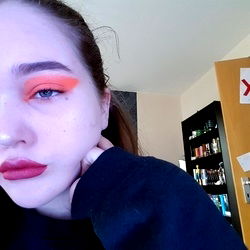 Princess Neila, a German model, showcases her unique style with vibrant eyeshadow and bold red lips. Her pose suggests she is in a creative or artistic setting. She's captured the essence of modern beauty with an innovative twist.
