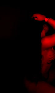 A snapshot from an adult content platform featuring a model in a red room. The model is captured in the midst of a dance or pose, with a confident and sultry expression.