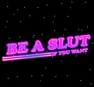 The image displays a vibrant and eye-catching sign for an adult event. The sign features pink neon letters that boldly declare, 'BE A SLUT IF YOU WANT'. This suggests that the event encourages self-expression in a sexual context, aiming to create a safe space for adults to explore their desires freely.