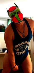 A person posing in a funny and revealing costume reminiscent of the Power Rangers, complete with a mask. The costume includes a wrestling singlet and thong, adding to the playful nature of the photo.
