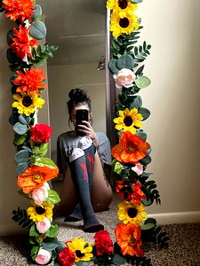 Model Marie in a seductive lingerie shoot, striking a pose in front of a mirror. The backdrop is adorned with vibrant flowers and a heartwarming 'love' sign, adding a touch of romance to the scene. #OnlyFans #Marie #Lingerie