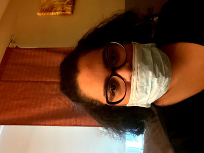 In this image, we see the OnlyFans model Missyamile. She is indoors, wearing glasses and a face mask. Her surroundings suggest a casual, relaxed setting.