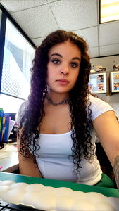 The image is of a young woman with long curly brown hair. She is wearing a casual green shirt and has a neutral expression on her face. The background is simple and does not distract from her. Her pose suggests a relaxed and candid moment captured.