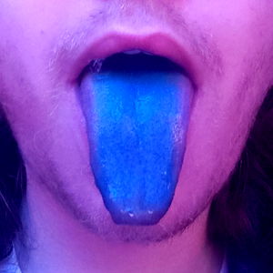 The Mist, La Noscea model wearing blue tongue effect. The model has a skank style and is making a playful pose with the blue-tinted tongue.