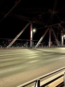 Striking image of an elevated metal structure, showcasing the intricate details and perspective. The bridge is illuminated against a dark sky, creating a dramatic contrast.
