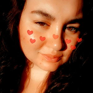 A young adult female with a lovely tattoo of a heart on her face. She has long dark hair and striking blue eyes.