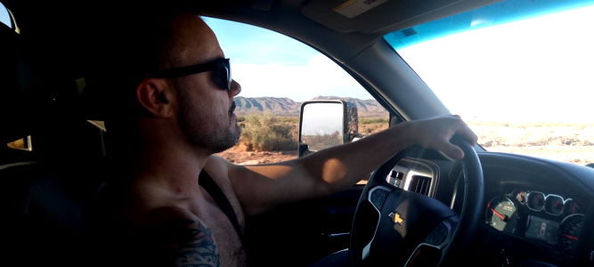 A muscular man is seen taking a selfie. He's shirtless and wearing blue shorts, showcasing his well-defined physique. His gym attire and the gym equipment in the background suggest he might be a fitness enthusiast or a bodybuilder. The image has a relaxed vibe with the man casually leaning against a bed, holding a phone to take a selfie. He is situated in an Arizona-themed room with a bed visible. His intense workout sessions are likely dedicated to maintaining his impressive physique.