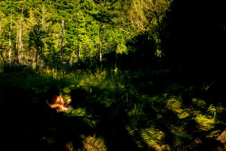 The iconic Barefoot Babe model photoshoots an alluring image, standing amidst nature with only a flower and brush to hide her form. Her hair flows freely around her, blending with the surroundings.