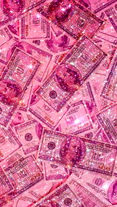 A vibrant, money-themed photo featuring glittering pink sparkles and a large number of US dollar bills.