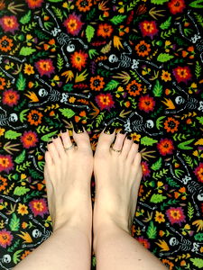 A unique and artistic expression of individuality in nail art, showcasing a bold and colorful floral print on toes against the backdrop of a patterned carpet. 30 years old. Female.