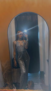 SweetMama, an OnlyFans model, captures attention with a glamorous sequin jumpsuit. Her pose against a mirror reflects confidence and style.