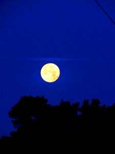 A captivating nighttime scene featuring a large, full moon rising above treetops. The tranquil atmosphere is further enhanced by the presence of a single power line in the foreground, adding depth to this picturesque image.