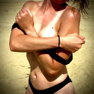 Redistribooty, a popular OnlyFans model, is captured in a sunny beach setting. She is standing on the sand, holding her arms tightly around her body with her elbows crossed.