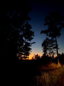 A tranquil nighttime scene in a Georgia forest with tall pine trees silhouetted against the deep blue sky as the sun sets.
