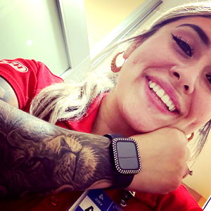 This image captures a cheerful tattooed individual wearing a red shirt and sporting tattoos on their arms. The person is holding an apple watch in their hand and has a bright smile. They seem to be in a good mood, enjoying the day outdoors. The background suggests they might be in a public space or near a building with a window. This could be a snapshot from someone's day-to-day life, possibly during their lunch break or an outing. The apple watch indicates that this individual values modern technology and stays connected to their digital world.