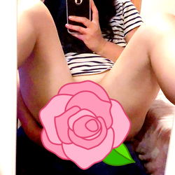 This image features an adult model in a revealing pose. The model is sitting on a bed with a pink flower emoji visible. The model's attire consists of lingerie, and their posture suggests an intimate or sensual theme. The background is simple and nondescript, focusing the attention on the model. This kind of image could be used for adult content purposes.